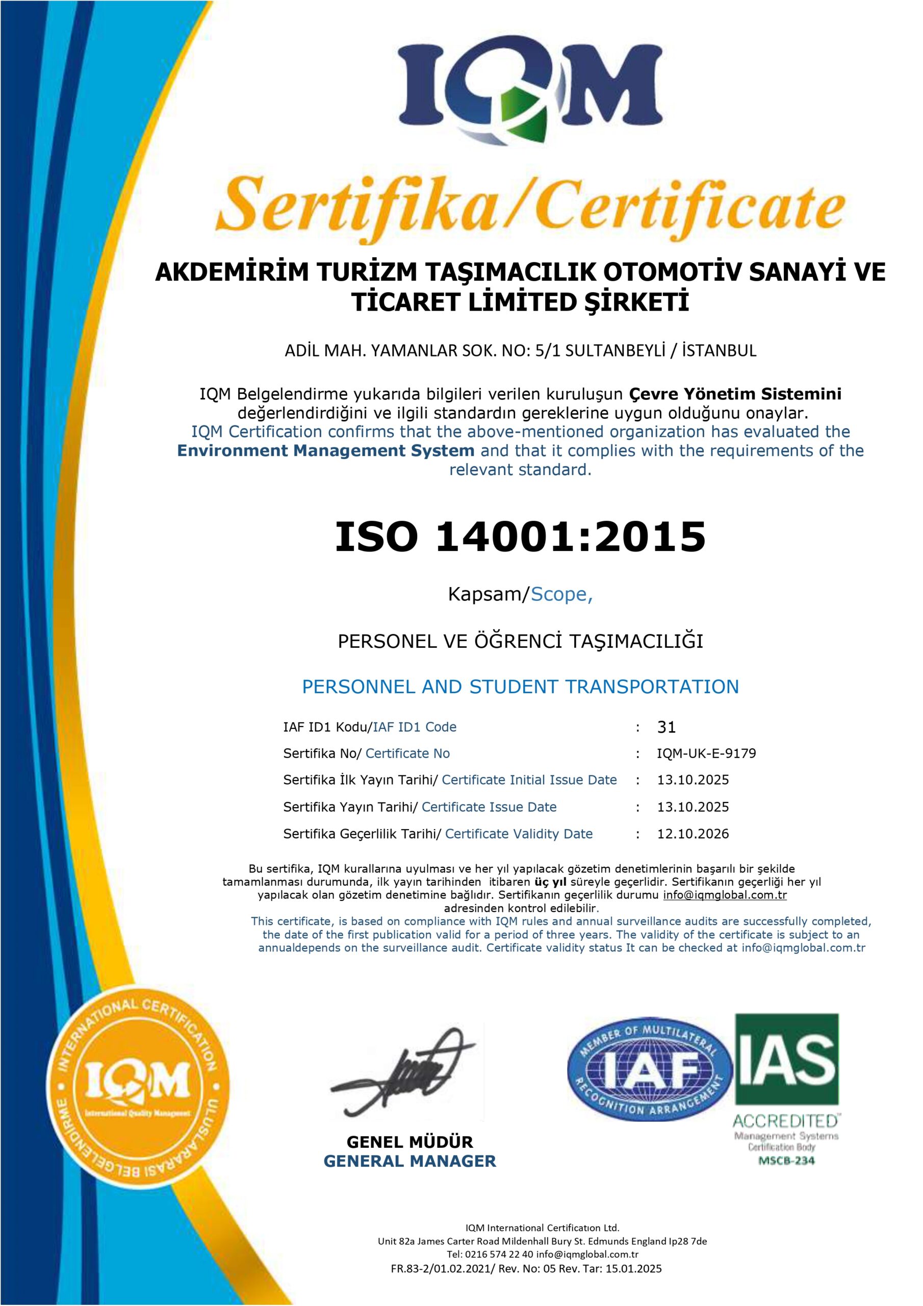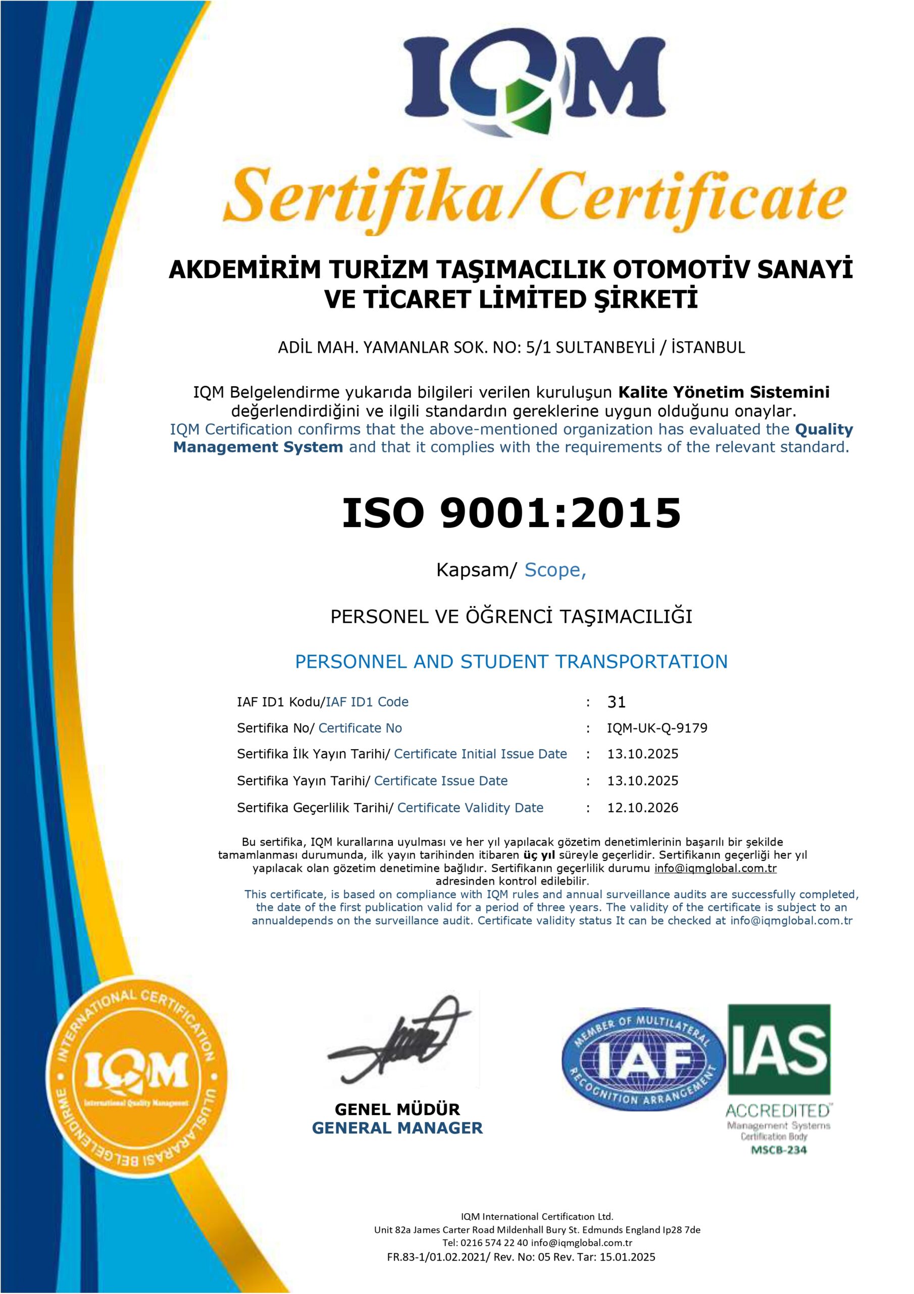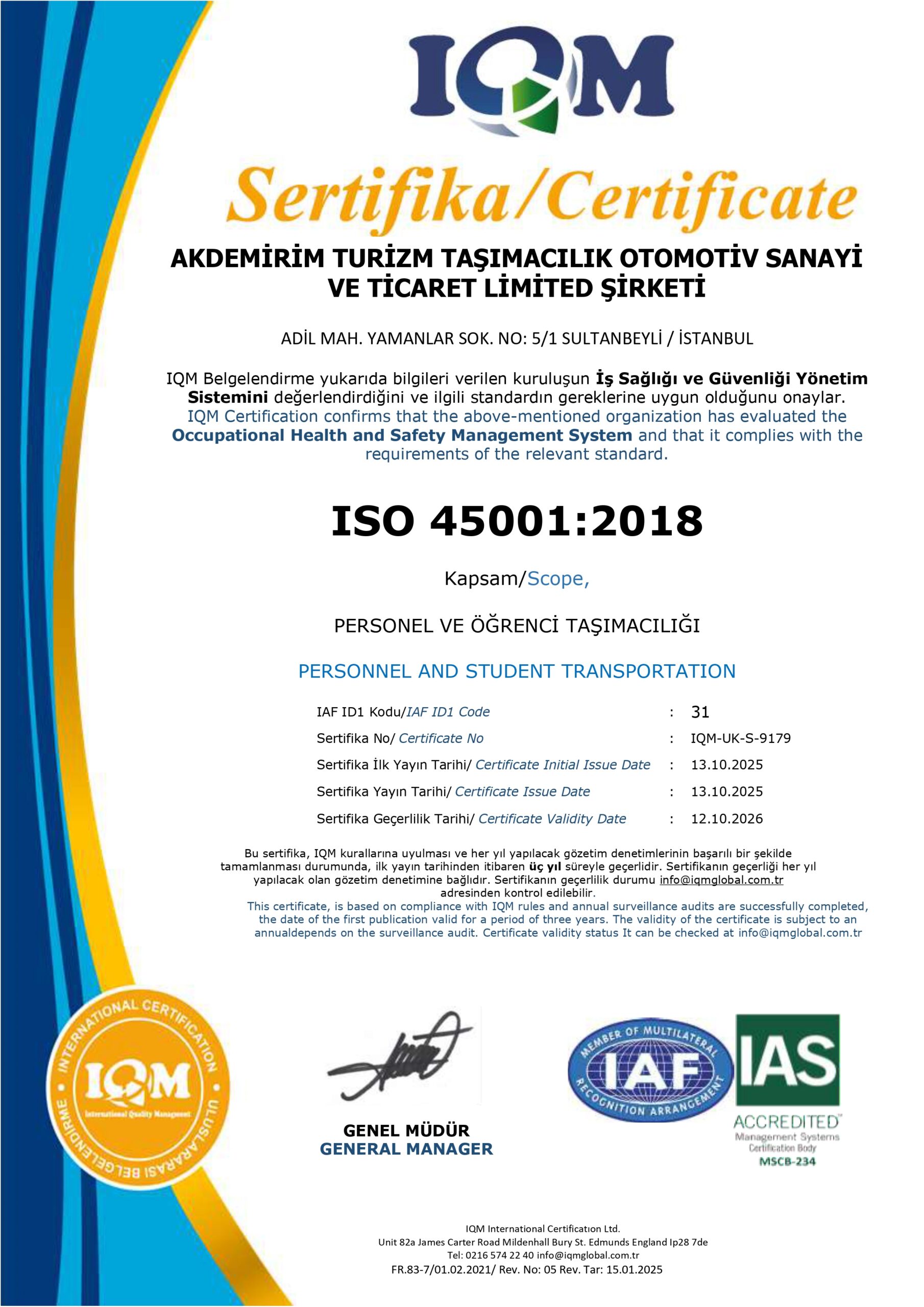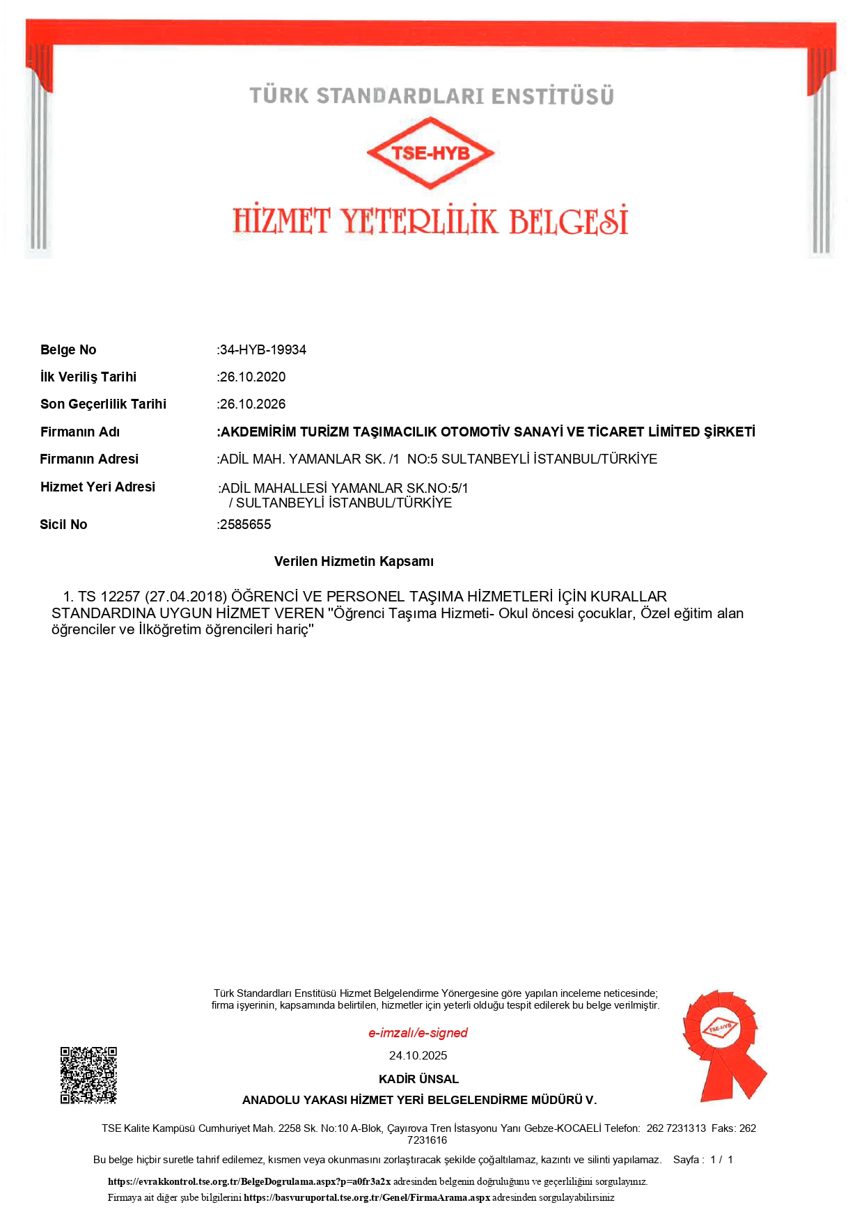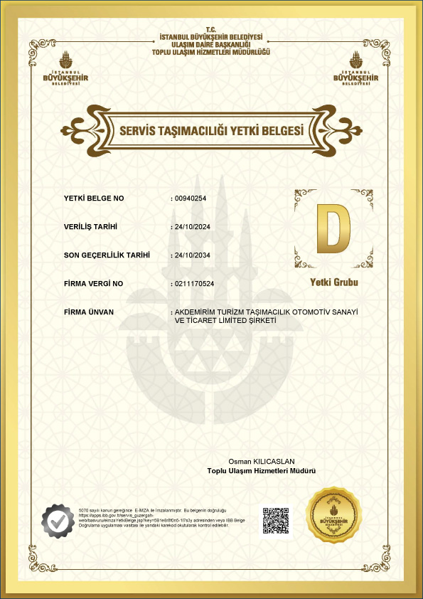 Akdemir Tur olarak güvenli, yasal ve kaliteli hizmet anlayışımızı sahip olduğumuz resmi belgelerle destekliyoruz. Tüm sertifikalarımız, taşımacılıkta profesyonelliğimizi ve güvenilirliğimizi belgelemektedir.